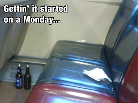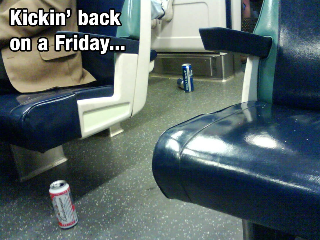 While riding the train I always see a lot of people drinking beer after work. I wonder if some people solely ride the train just because they can drink and ride, instead of getting arrested for drinking and driving. I also notice that just about every single person who drinks beer, leaves their empty beer bottles and cans on the train when they get off. You know, just so everyone sees how cool they are that they drink and ride. Everybody know you gotta show off like dat, yo.