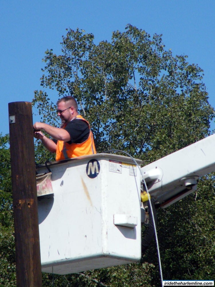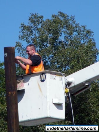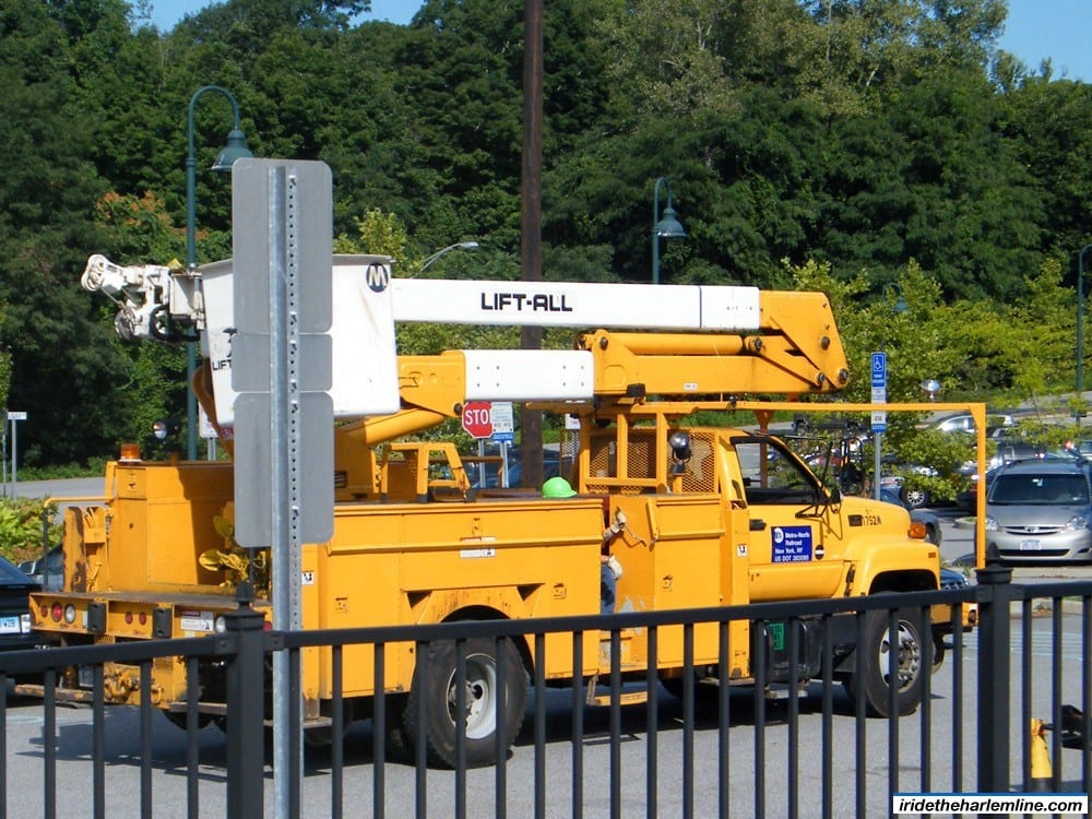 In order to get to the bus, I took the train down to White Plains from Goldens Bridge. I’m not exactly sure what kind of work is going on there, but there were several trucks and such doing some construction work at the station. I will honestly admit to you right now that I did not know that trucks that can ride also on the rails even existed. Then I saw a yellow pick-up truck fly right past me as I was waiting on the platform. It was too fast for me to snap a picture of, but apparently these larger trucks that were also there have little track wheels that can pop down and allow it to ride the rails.