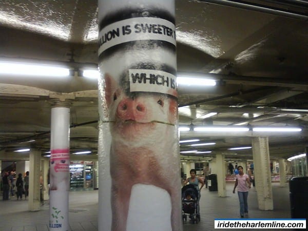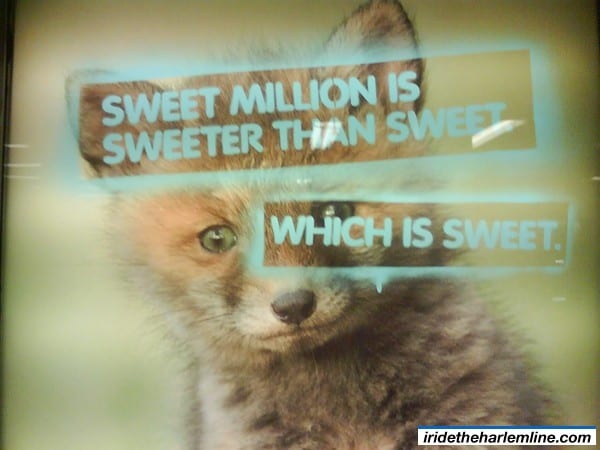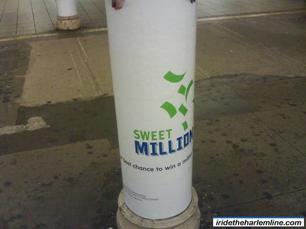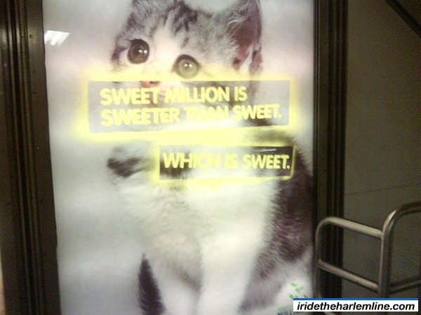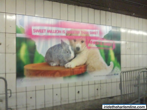 The New York Lottery has come up with this new game: Sweet Million. They’ve been advertising like crazy in trains and stations, but I don’t think I really mind. The kitties and puppies and bunnies are so cuuute! The bunny poster is up in my Metro North train, and apparently the Times Square subway station is covered everywhere with ads for it. Large posters on the walls, backlit posters, ads covering the stairs, and ads wrapped around pillars… most of which are in the vicinity of the S train / Shuttle to Grand Central.