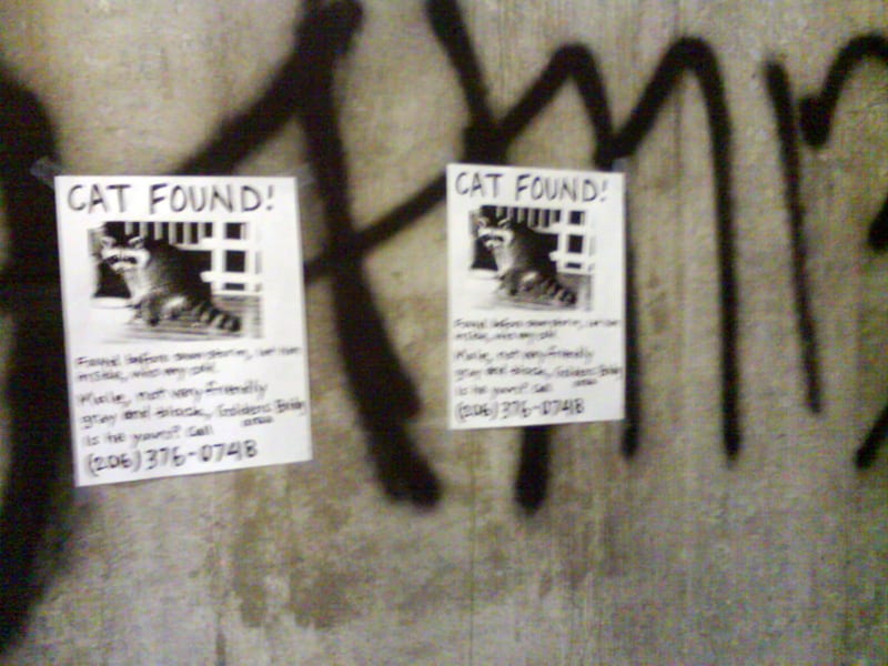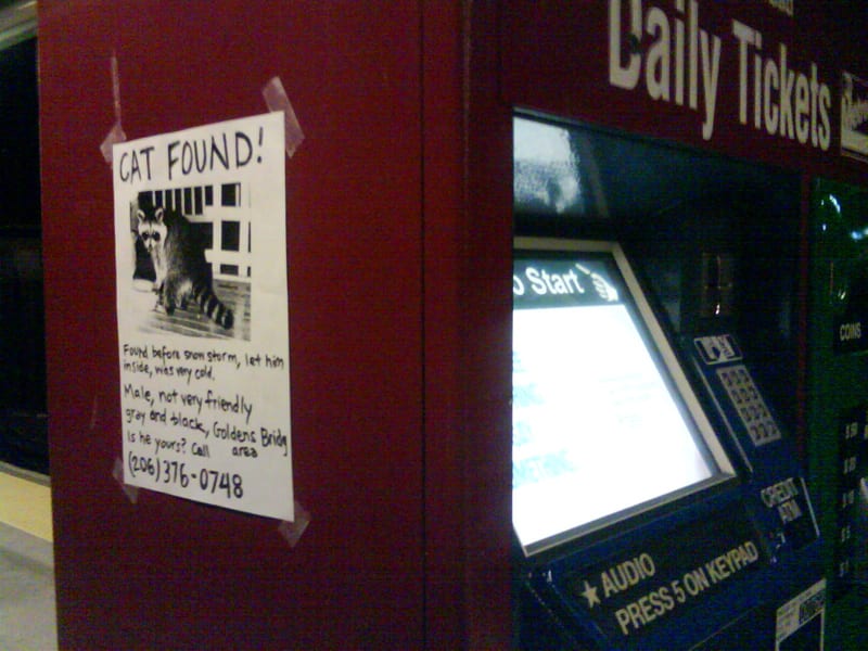 Monday night I hung six of these posters. By Tuesday morning two were missing, and by this morning there were only three remaining, on the south side platform and the south vestibule stairwell. I was hoping that someone would call the number on the poster and say something amusing, but thus far I’ve received no calls. Yes, the number is in fact a real voicemail number. If you call it, any message you leave will be emailed to me.