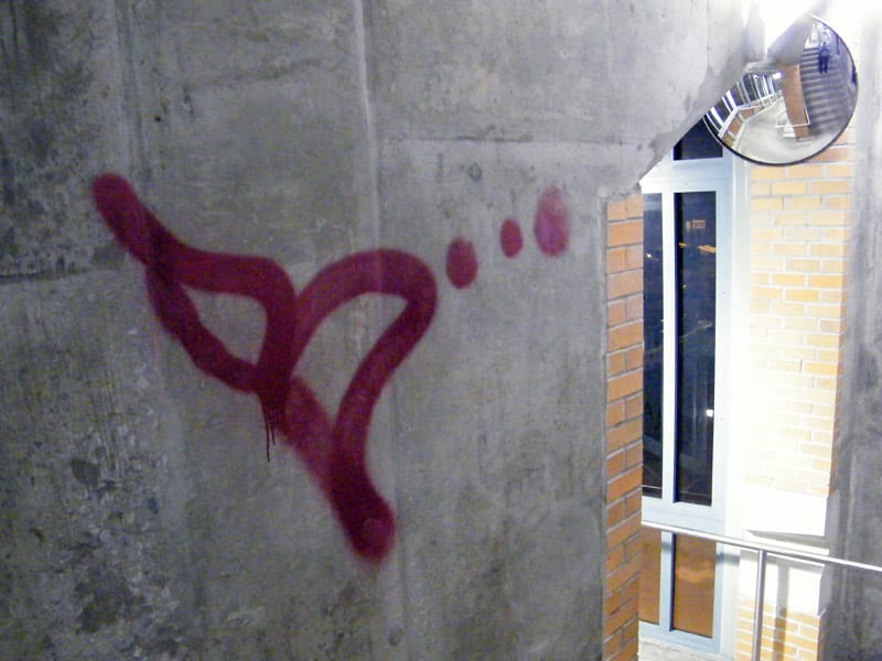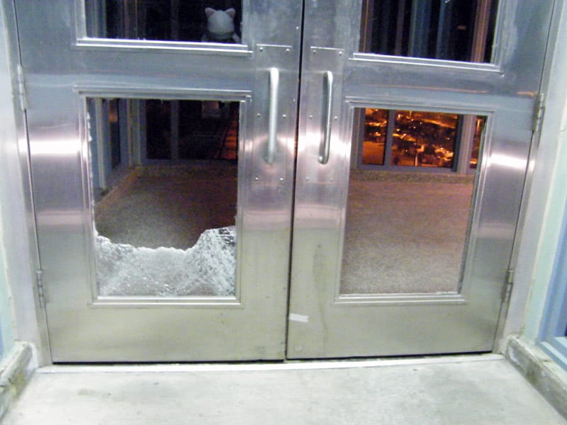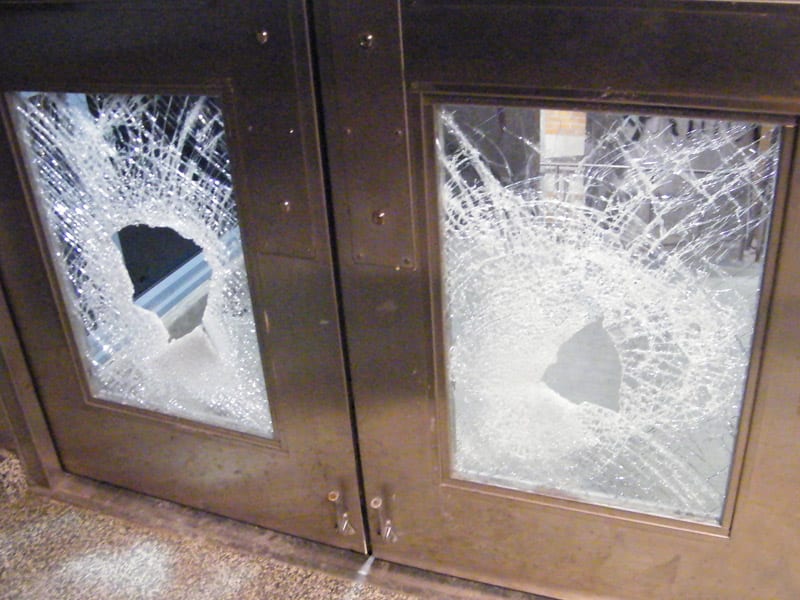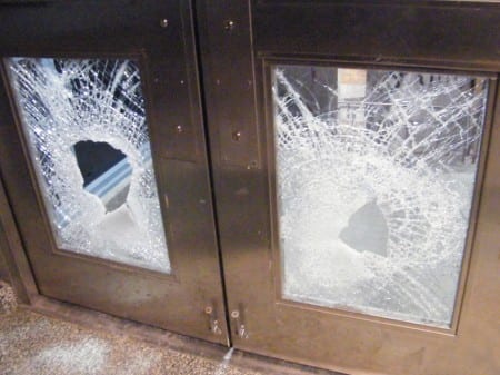 After writing all of this, it seems that everything is pretty normal over in White Plains. But on the home front, Goldens Bridge, it seems that everything is not. Here we don’t have pigeons, but people terrorizing the station. I wouldn’t be surprised if it is the obnoxious area skater kids, drunk on a weekend with nothing else better to do. They’re probably the ones to blame for the graffiti I mentioned before (and some new graffiti that appeared this afternoon), but maybe not for the weekend’s escapade of kicking in all the glass panels on all the doors of the south side vestibule. Maybe it was creepy, perpetually drunk Santa Claus. Who knows? Though, uhh, Metro-North? I can live with the fact that you never wash the windows. I suppose I will live, albeit a little frustrated, when you don’t clean up the graffiti. But umm… will you at least fix the glass? Is this train station even safe? Should I be carrying mace around on my keychain?