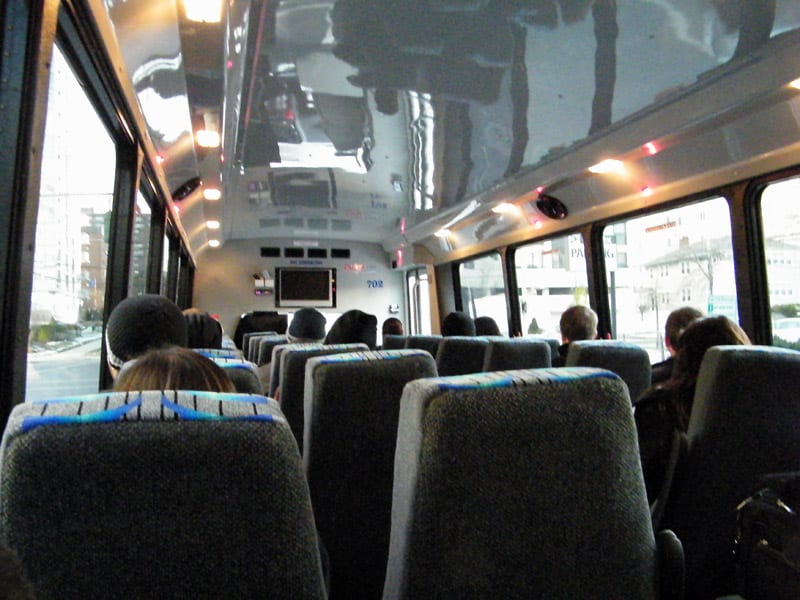 Though the new bus is nice, I must admit. It turns out that the robot man is not our driver, it is some other guy. And we thought the robot drove slow, this as yet un-nicknamed fellow is even slower. Even poor bag lady missed her train (boo hoo). Just the part that the bus no longer picks us up in front of the train station isn’t the most fun. At least there you could wait in the vestibule, which is at times warmer even than the waiting room. Now we get picked up across the street by the Greyhound stop, and thus have no warm place to wait. (and now I deserve a good sarcastic boo hoo for myself).