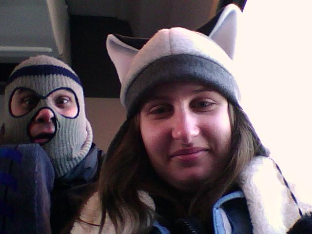 Me, the new hat, and the return of the masked bus rider! I look like a fool, but I’m trying my best not to burst out in laughter at his expression.