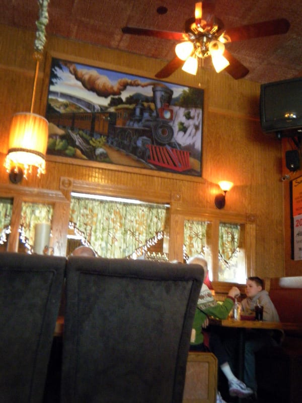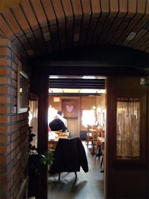 Of course I brought my camera for documentary purposes, and the decor was quite nice in the place, so I took quite a few pictures. Our waitress told us that most of the woodwork in the room where we sat was not original, but the floor of the bar is the original station floor. Trains regularly pass by the place, which is kind of cool to watch. The noise from said trains was not bad at all, I’ve heard and felt worse in the city when subways pass by underneath. Though thinking about it, during the lunchtime hours mostly M7’s were going by… I imagine one of the diesels passing by is sure to jolt you from your reverie.