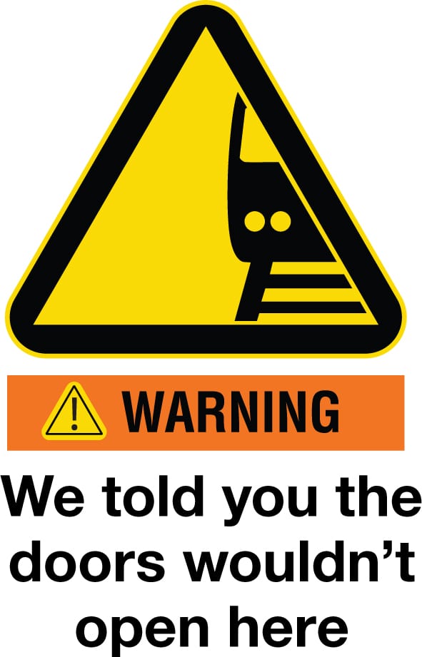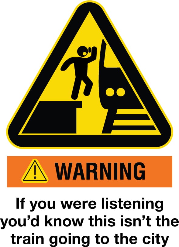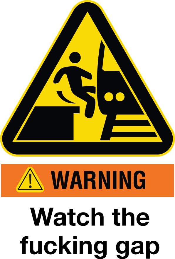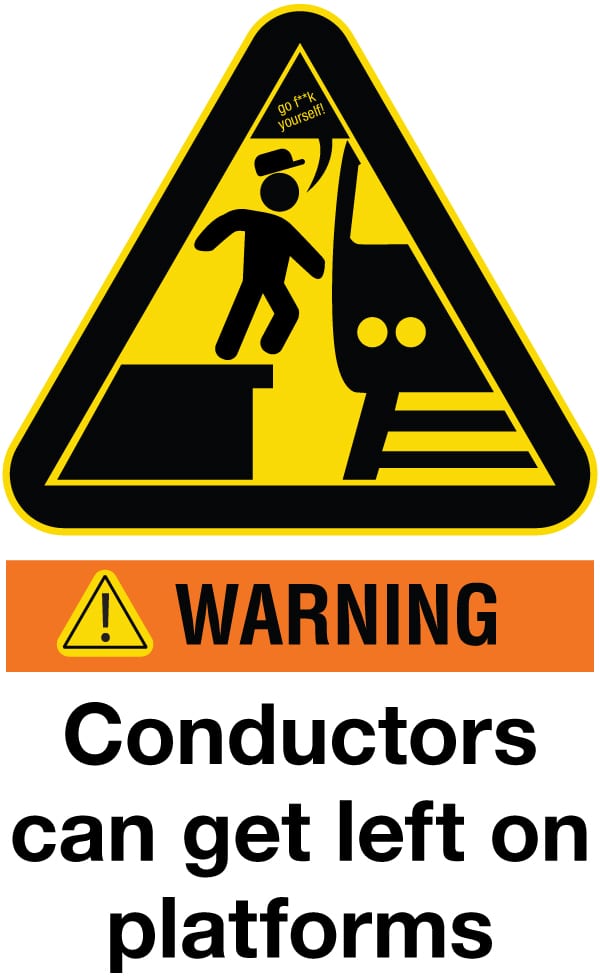 I had made these a long time ago, and forgot about them. My goal was to create a warning sign generator, where you could type in your own warnings and the site would create the image for you. I never did get around to doing it, but perhaps some day. Until then, enjoy these. Gina, a train conductor on my train, almost getting left on the platform again the other day (and did actually happen a year ago) made me want to go and dig these up. The first one below is dedicated to her. In fact I hear a version of this is now in the conductor’s lounge in Grand Central, a version with a spectacular little arrow pointing to the conductor on the platform, labeled with the name “Gina.”