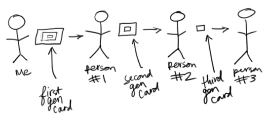 Roughly this is how it works. I give out a card to one person, but if it all works out, three people total end up getting cards.