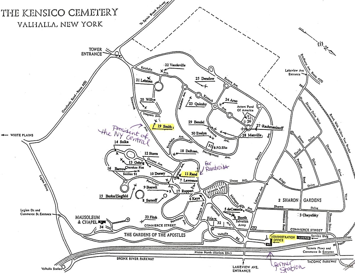 Buried in the cemetery are quite a few famous people, including Alfred Holland Smith, who was the president of the New York Central. He died in 1924 in a freak accident in Central Park. Ayn Rand is another person buried in Kensico. Although she is not directly related to the railroad, she did research into the New York Central railroad while writing her book, Atlas Shrugged. Not only was she allowed to ride in the locomotive of the 20th Century Limited train, they allowed her to drive it. The character from the book, Nat Taggart, is supposed to be modeled on Cornelius Vanderbilt.