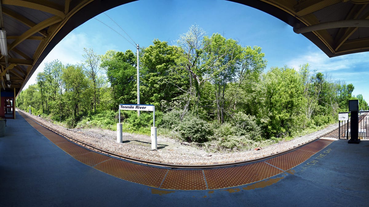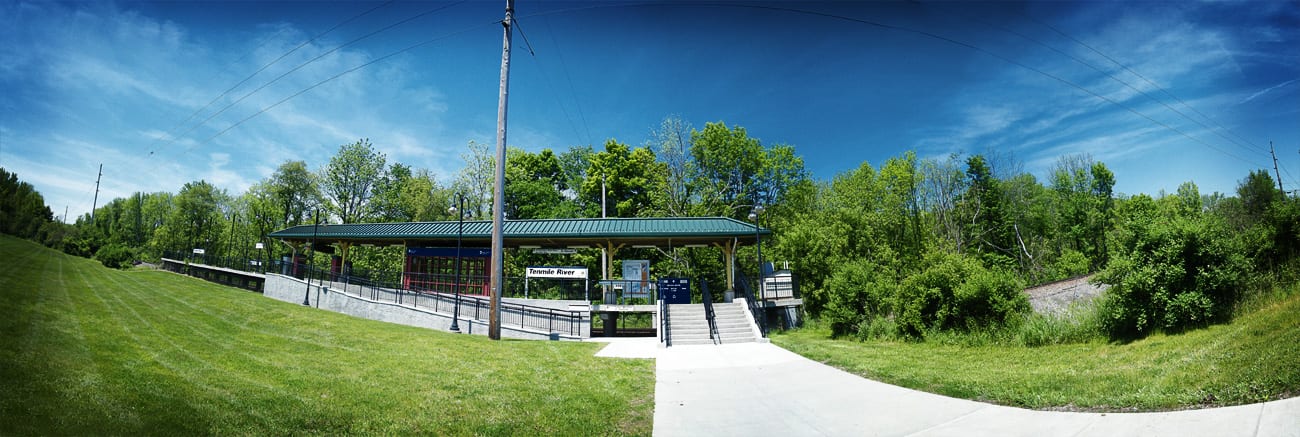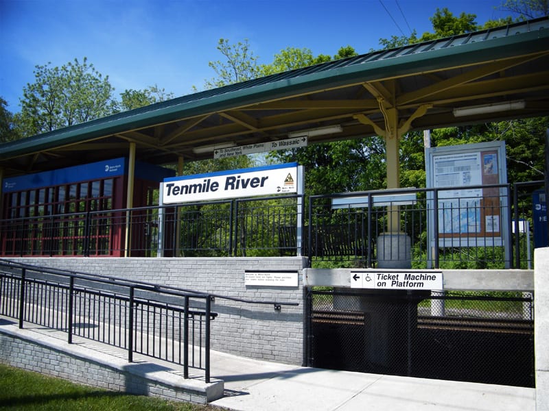 Nestled in a lush carpet of green grass is a station on the Upper Harlem called Tenmile River. As to be expected, the name derives from a river of the same name. The station was completed and opened by Metro-North in 2000, along with Wassaic. In the New York Central and Penn Central days there was another station at this location, called State School. That station was closed in 1972, when service north of Dover Plains was discontinued. Tenmile River is the second to last station on the Harlem Line, and 78 miles from Grand Central. Similar to most Upper Harlem Line stations, Tenmile River is in a very rural area. Despite this, many of the stations find themselves close to or on the main road of Route 22 – Tenmile River seems to be the most isolated. But with the gorgeous grass and the recently built station platform, Tenmile River may be one of the more attractive stations on the Harlem Line.