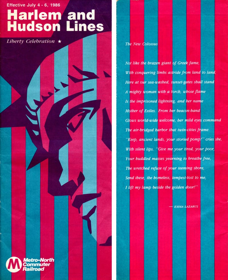 The poem was written in 1883, and was put on a plaque at the Statue of Liberty in 1903… and probably a million other things since then. It refers to the immigrants coming to the United States, many of which saw the Statue as they arrived at Ellis Island. Immigration is a bit of a taboo subject to discuss nowadays, but it is true that historically immigrants had a significant impact on the growth of the United States. And even on the railroad… Chinese immigrants provided much of the labor for the first transcontinental railroad in this country. So in a little way, this railroad timetable is perfect in its symbolism. But that is just me overanalyzing things… have a happy holiday weekend everyone. If you’ll be taking the train, be sure to check out the holiday schedule here.