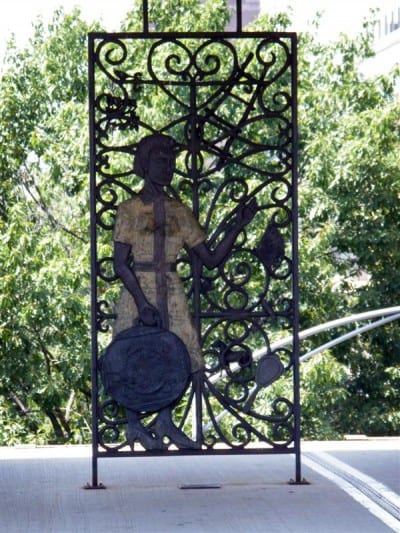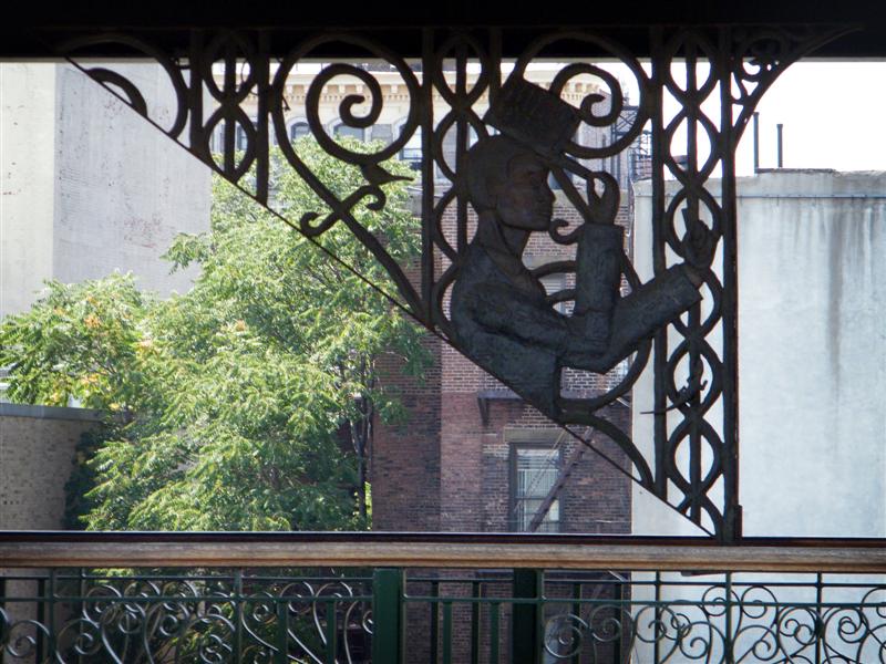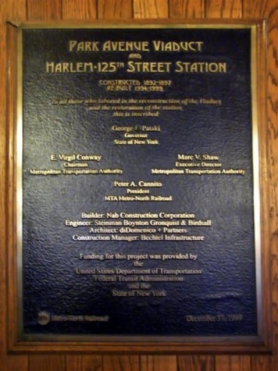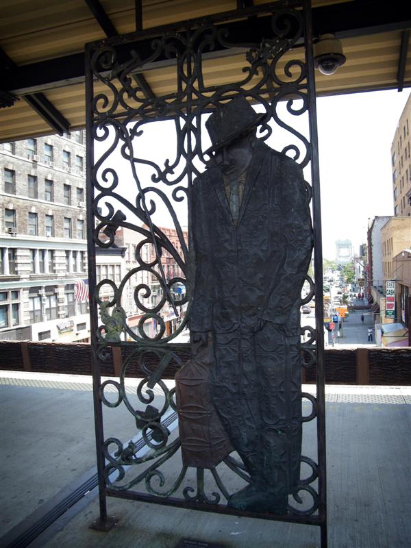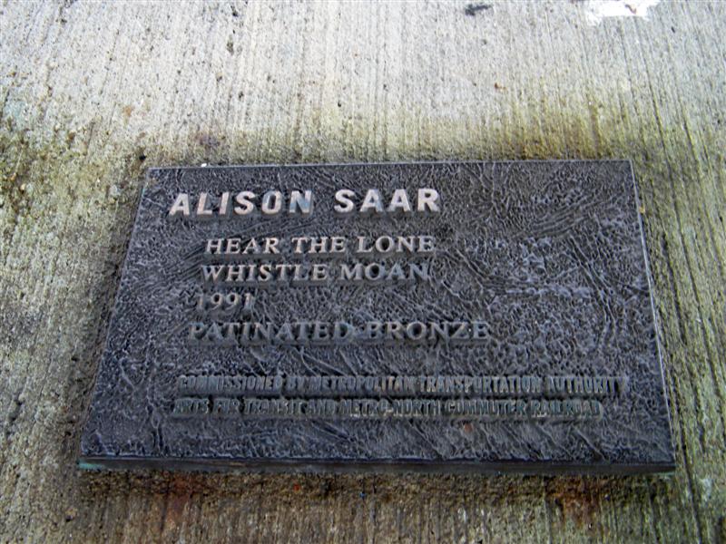 Although I photographed one of the Arts for Transit pieces, there are actually two at Harlem-125th Street. Visible from the street is a piece by Terry Adkins, titled Harlem Encore. More visible from the platforms is a work by Alison Saar, titled Hear the Lone Whistle Moan. Saar is a California-based artist and has done public art in various cities, including New York, Sacramento and Chicago. The piece consists of three separate figures, each made of bronze. On the southbound platform is a young woman, heading to the city for work, and on the northbound platform is an older man, leaving the city and heading back to his hometown. Near the stairs there is also a smaller bronze figure of a train conductor. The artist describes the title of the piece as follows: