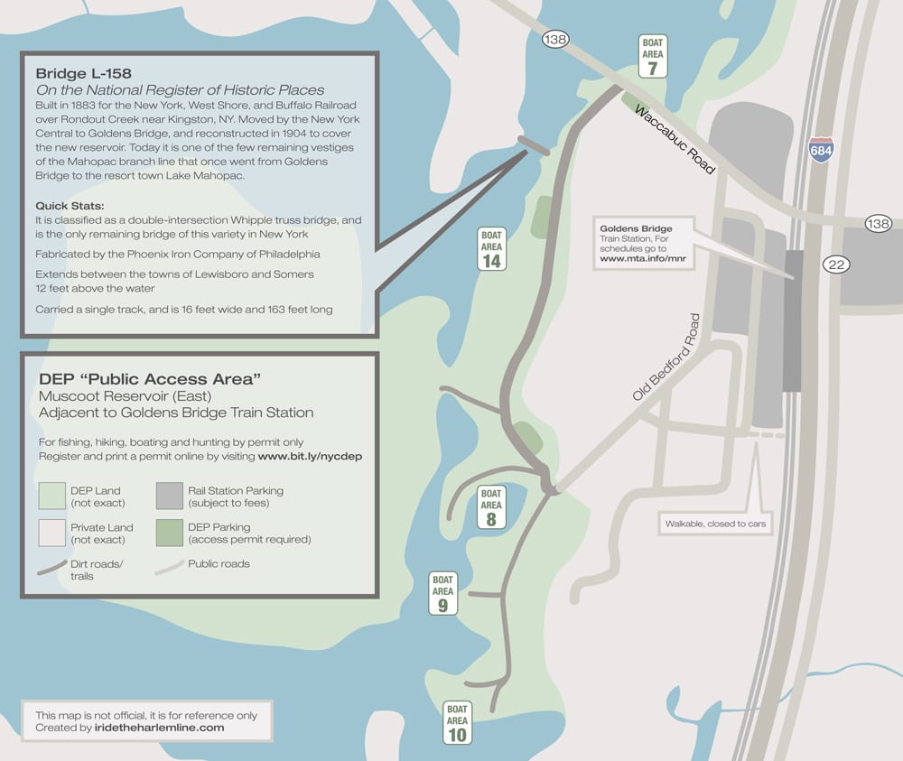 If you’re interested in visiting this part of the Harlem Line, it is within walking distance of Goldens Bridge station. Although it is rarely enforced, you do need an access permit to use the land for recreational use. But access permits are easy to get – you can register for one online and print it out immediately. If you’re interested in fishing or boating, you’ll need additional permits, so I advise checking the DEP’s site. People fish in the reservoir all year long, as the Muscoot is one of the reservoirs in which ice fishing is permitted. Although it is a lot smaller than some of the other nature spots around it is at least worth visiting to see the historic bridge. There are some times where it gets so quiet, except for the crunching leaves under the foot of a squirrel or deer, that you forget that you’re not that far from the city… only until you hear a train go by, yanking you back to reality.