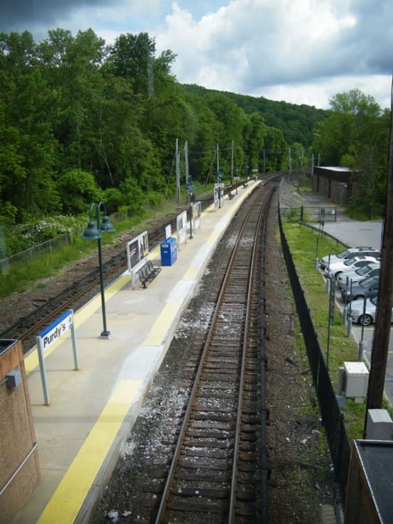 Several months ago I wrote about some of the names of the towns located along the Harlem Line, and how they have evolved over the years. Many of the names were taken from the families that owned the land, or perhaps donated it for the railroad to use, and the name had a possessive. For example, Brewster was known as Brewster’s after former land owners James and Walter Brewster. “Golden’s Bridge” was always a particular enigma, as the majority of use has evolved beyond the apostrophe (town signage does not use it, and the railroad stopped using it in 2003 on public timetables), yet the area’s fire department still uses the apostrophe, as does Google maps. There, however, is one remaining station that still bears the apostrophe of yesteryear, and that station is Purdy’s.