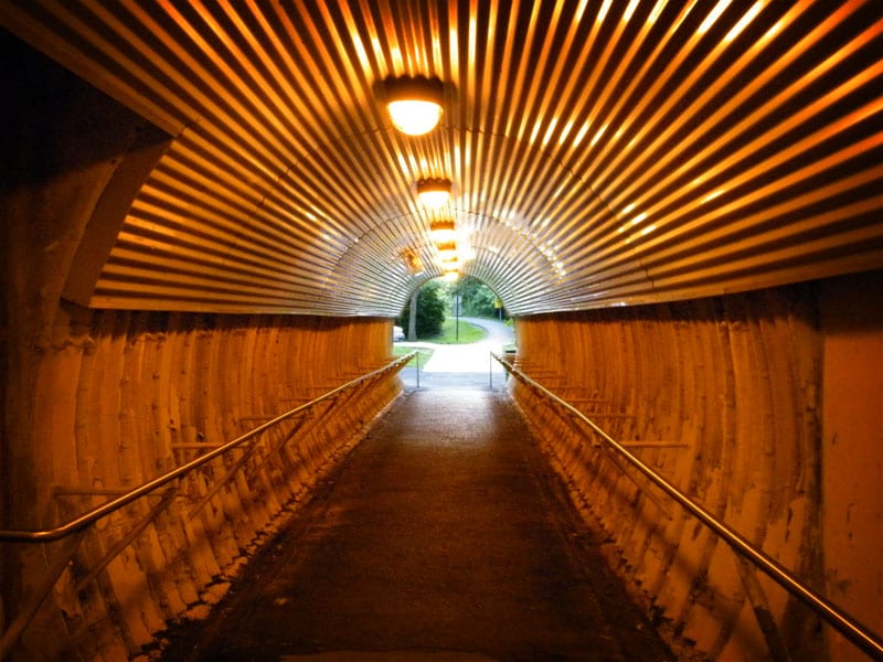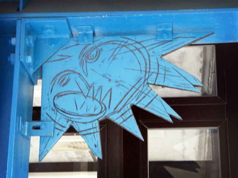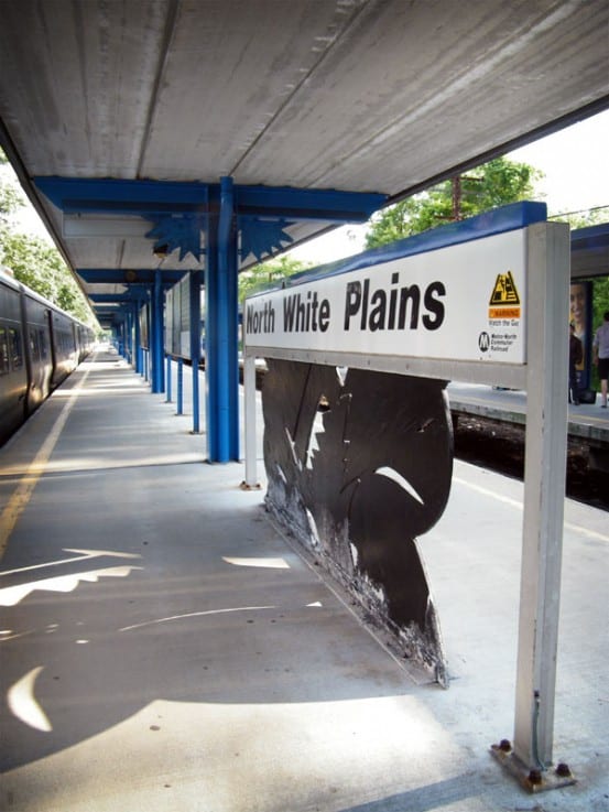 North White Plains is also one of the few Harlem Line stations to have an Arts for Transit piece. Installed in 1991, Rolando Briseño’s piece is titled At The Table. Although Briseño was born and works in San Antonio, Texas, he worked towards his MFA in New York City. His public art can be found at various different locations across the country – from airports, to train stations, and schools. The installation at North White Plains is made of cast aluminum on the platform’s columns. Several additional pieces can be seen underneath the station signs on the middle of the platform. In all honesty, this is probably my least favorite Arts for Transit piece that I’ve seen to date. I’m not exactly sure what it looked like when it was installed, but it looks like it has suffered under the elements. Years of salt on the platform during the winter looks like it ate away at the black paint on the bottom.