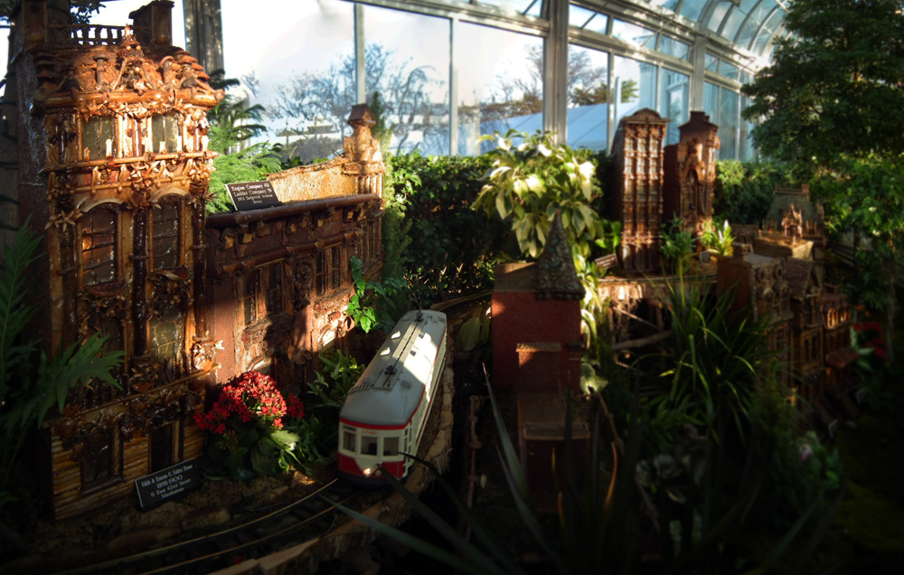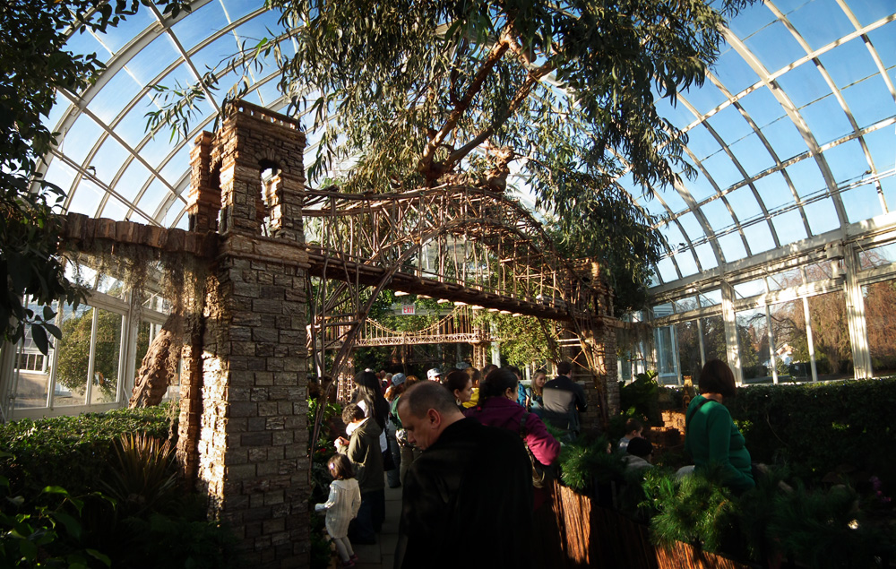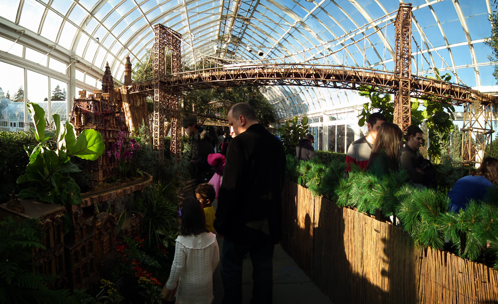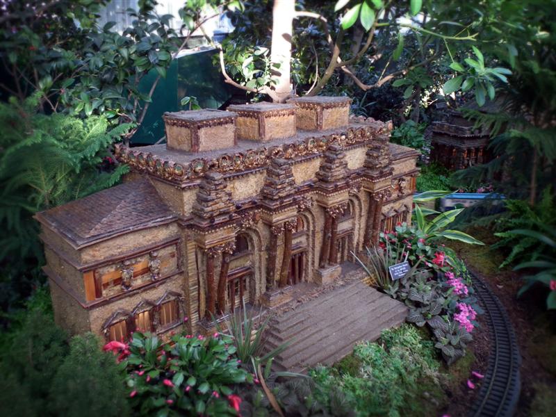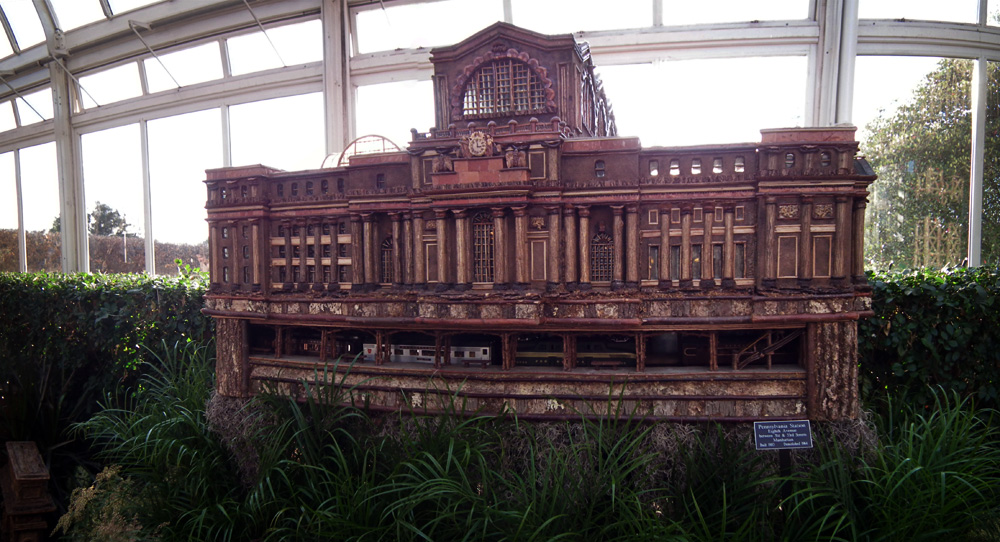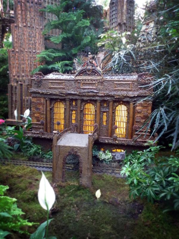 Several weeks ago I got a chance to take my first visit to the New York Botanical Garden to see the Holiday Train Show. For all the folks out there that have any experience with model railroading, you are familiar with the fact that it is a rather expensive hobby. I can only imagine how much the setup at the Botanical Garden took, not only in dollars, but in time as well. The amazing array of recognizable current and historical landmarks is astounding, and created of plant matter. I was quite fascinated with the beautiful textures: the layered leaves and twigs that comprised the roofs, covered bridges made of tree barks, building details made of seeds and acorns, and the thin imitation of glass illuminated from the inside. Current landmarks, such as Grand Central Terminal, stand side by side with recreations of the city’s long-gone masterpieces: from the house of William Kissam Vanderbilt that once stood on Fifth Avenue, to the stunning Pennsylvania Station.