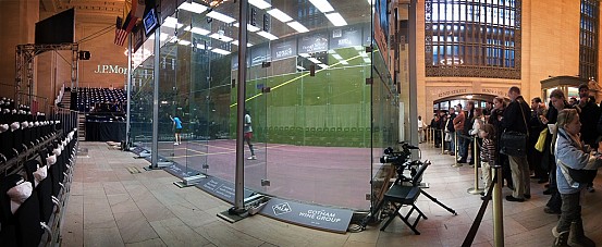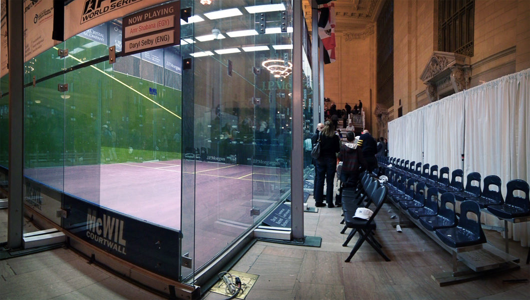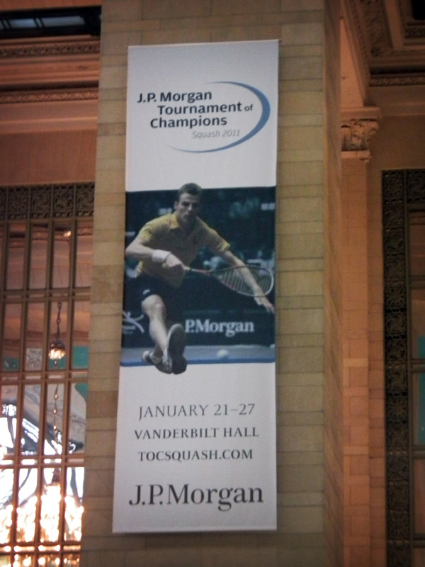 Hope everybody out there is enjoying this snowy Wednesday… Actually, who am I kidding? I’m sick of the snow, and I think most train riders will agree with me on that one. Let’s take your mind off of that with some photos from the squash tournament in Grand Central. The whole idea of constructing a glass cube for the purpose of playing squash in a railroad station is a bit amusing to me. But at the same time it feels like an appropriate nod to history. The tournament is sponsored by J.P. Morgan, a modern banking company originally named for John Pierpont Morgan. Morgan was a banker, as well as a financier of railroads.