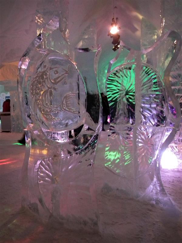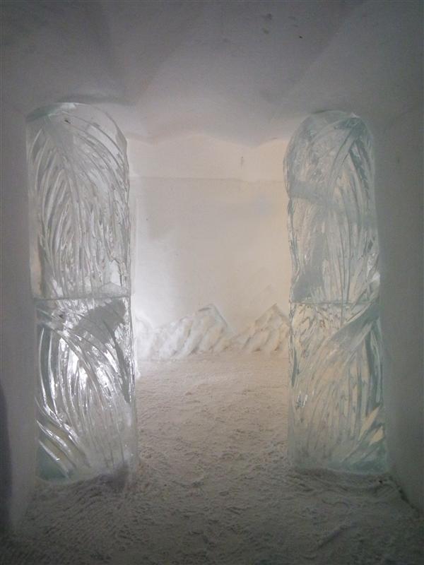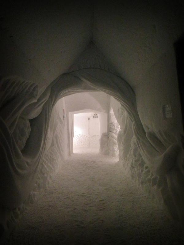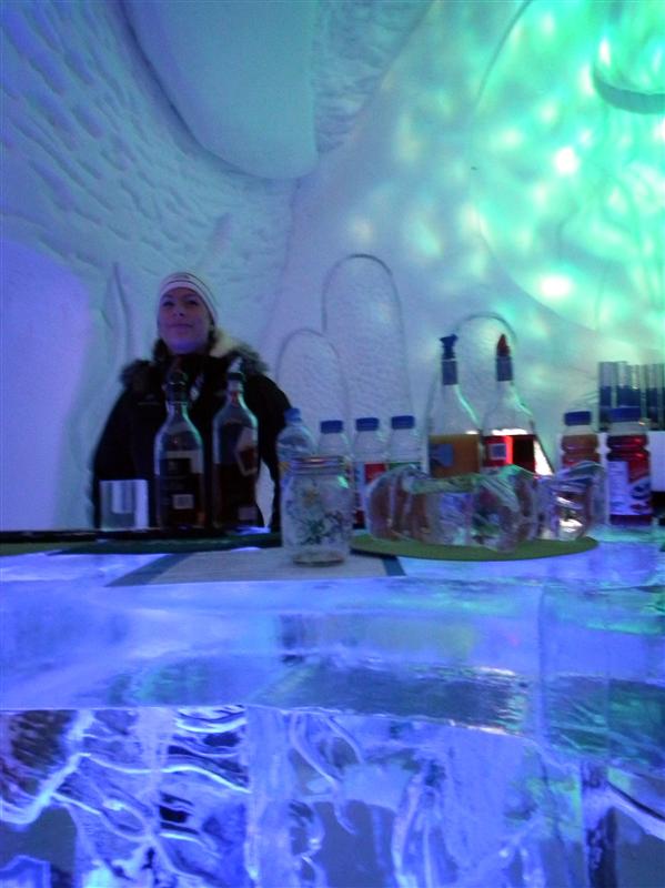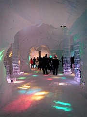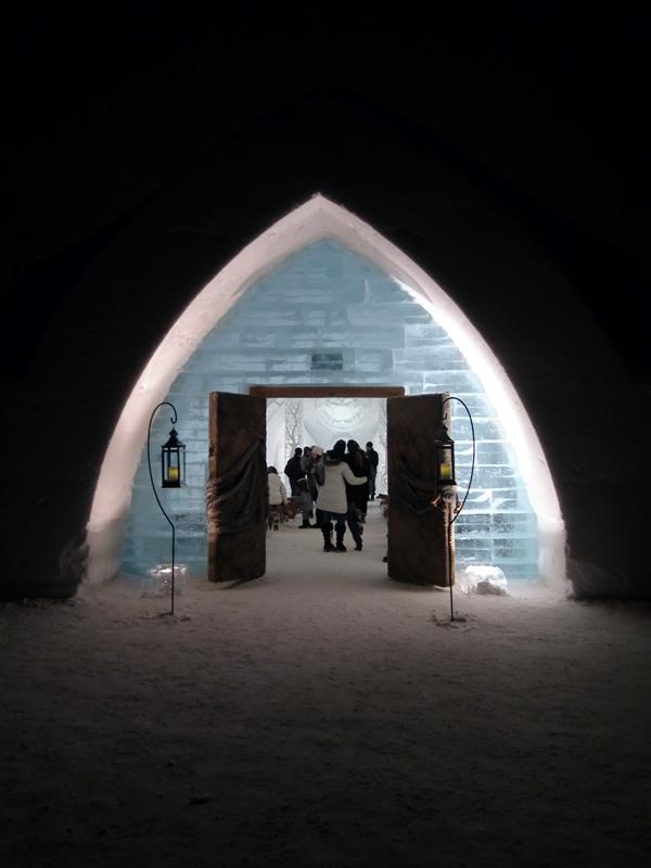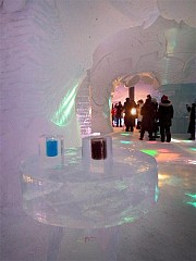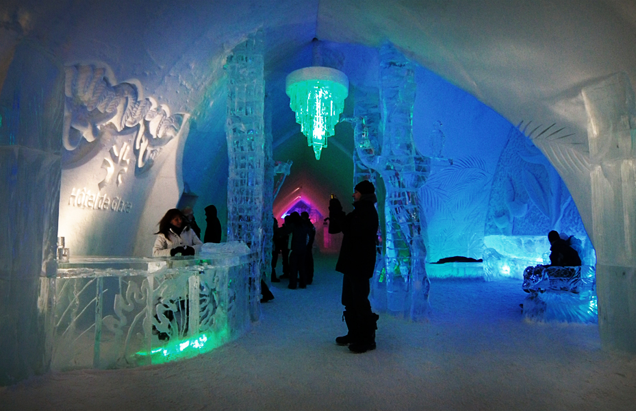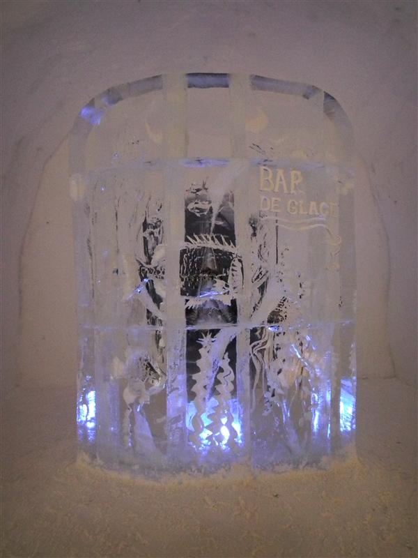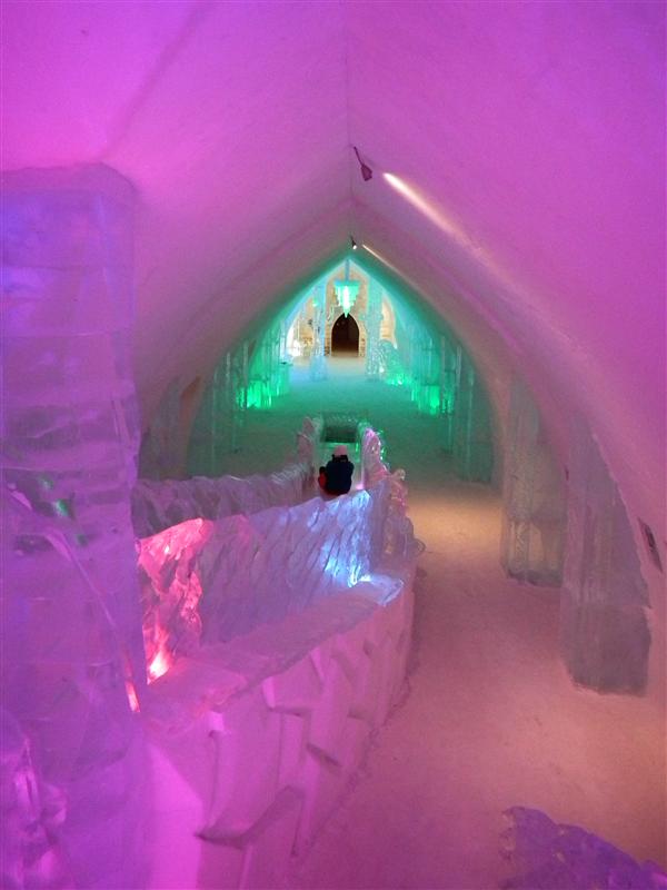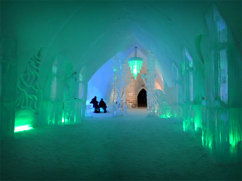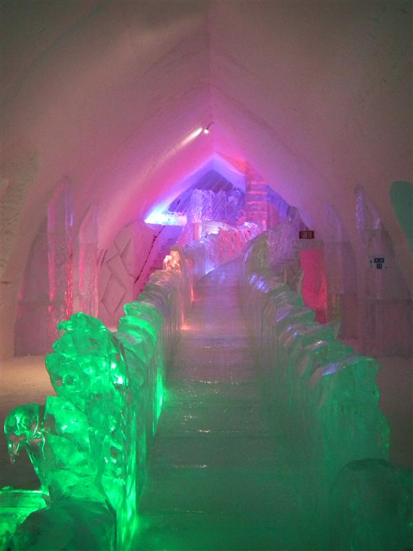 The Hôtel de Glace is made entirely of snow and ice, has 32 guest rooms, as well as an ice bar, and ice chapel, and an entrance room with an ice slide. In the evening everything is illuminated with colored lights, and it is absolutely gorgeous. Upon my arrival the ice bar was filled with folks drinking out of cubed glasses made completely of ice. I was rather cold much of the time, but it was quite the intriguing, and beautiful adventure.