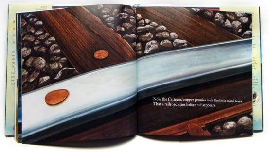 The spread above is definitely my favorite illustration from the book, and the one below my favorite part of the text. I definitely remember putting pennies on the tracks when I was a kid. Obviously not in Metro-North’s territory, but out in the hills of Pennsylvania, waiting for a freight train to pass.
