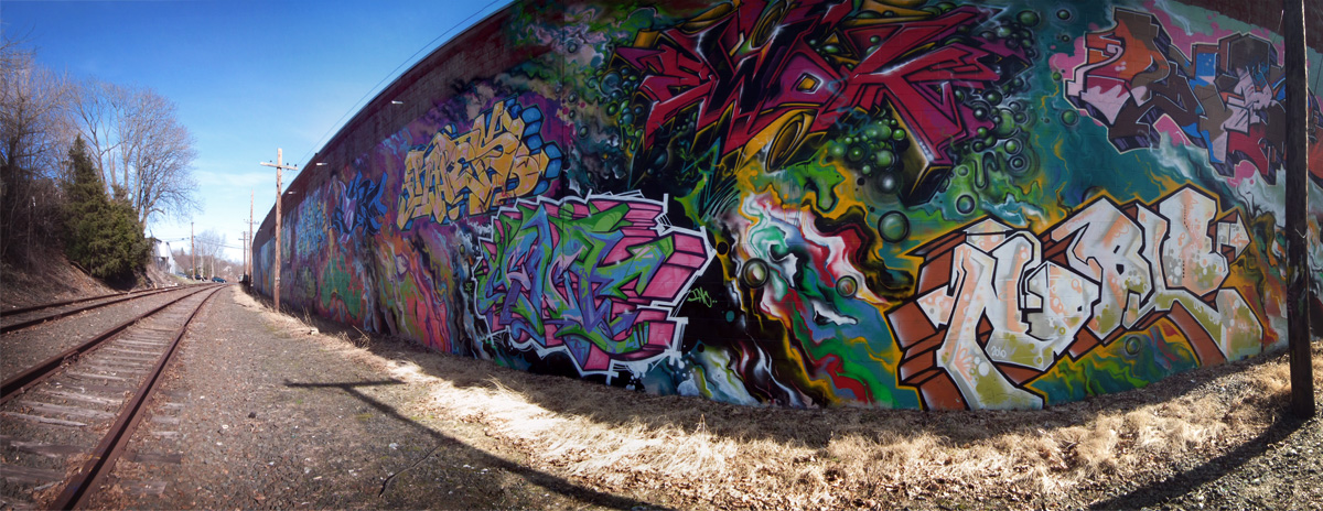 I have a new favorite bit of graffiti that I absolutely had to post photos of. Although the piece in between Valhalla and North White Plains I mentioned a while back is still my favorite on the Harlem Line, it certainly pales in scope to this graffiti I just discovered along the tracks in Danbury. Well, I shouldn’t say “just discovered” – I had noticed it in the car for quite a long time, probably even a year or more. I kept thinking to myself, one of these days I have to come back with my camera. Over the weekend I did just that. From the road, however, it is impossible to notice how grand this piece really is. It is quite immense, taking up a huge wall. I keep looking back at the pictures I took, thinking that this wall is just so amazingly gorgeous (and one of these photos is currently my desktop background).