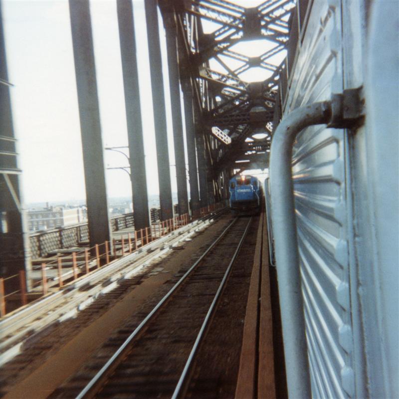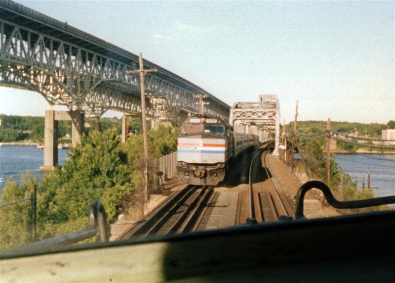 I think those Amtraks are on the Shore Line’s Thames River Bridge in New London. No third rail, no catenary, two tracks, and what I think is I-95 to the left.