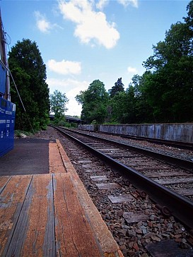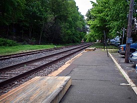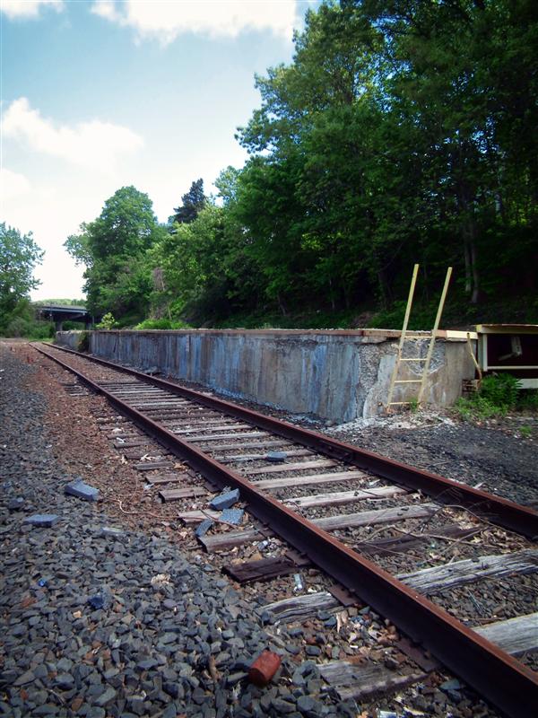 The concrete platform across from Seymour station was used by the nearby Keyrite Cable Company to load oversize spools of cable onto flat cars before freight service was discontinued along the Waterbury Branch.