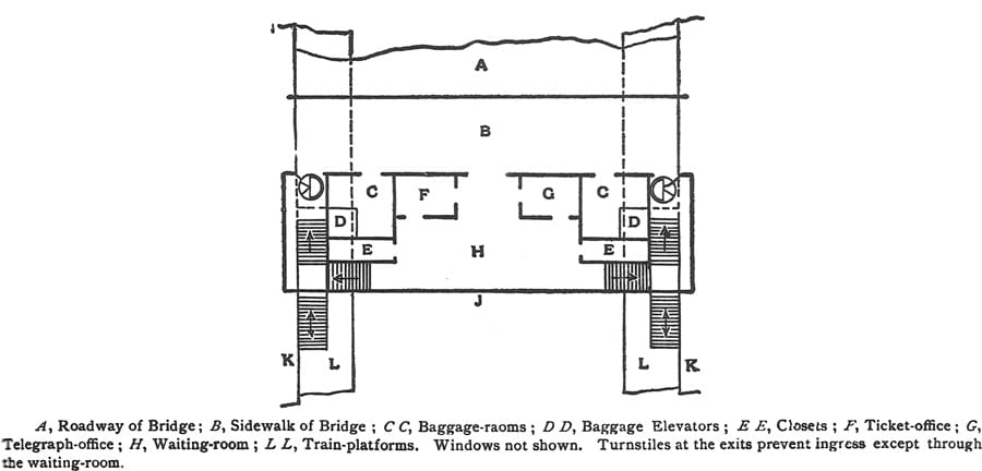 Today, Melrose isn’t the most spectacular-looking station on the Harlem Line. But at one time, it did have a nice station, built in the late 1880’s, or early 1890. It had all the amenities a station of that era needed: a baggage room, ticket office, telegraph office, a waiting room, and of course access to the low-level platforms and trains. The area was four-tracked even at this early date, though the two middle tracks were separated from the outer tracks by a fence, visible in the station sketch below. The Chief Engineer of the New York Central and Hudson River Railroad at the time was Walter Katte, and he oversaw the work on the Harlem Division, north of the Harlem River Bridge. The line was four-tracked, and the tracks were lowered into the “Harlem Depression,” extending from Melrose to William’s Bridge. He also oversaw the construction of the Park Avenue viaduct, and a drawbridge over the Harlem River.