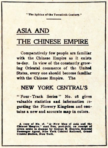 The New York Central even promoted venues that weren’t at all possible to visit by train – like China! A 1904 advertisement suggested all Americans should become familiar with the Chinese Empire: