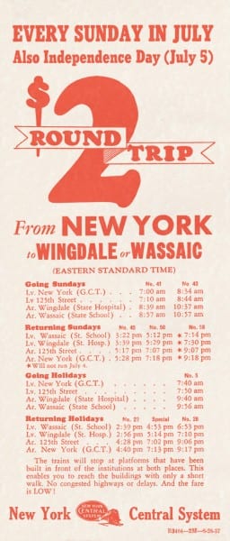 Another advertisement that I recently acquired is a little bit closer to home. Published in 1937, this New York Central ad offered discounted tickets from New York to Wingdale or Wassaic. Now think about this for a second, if you are familiar with the area, what was particularly noteworthy about those two towns in that era? If you said that they both had facilities for the insane and mentally handicapped, you win a prize. The Harlem Valley State Hospital is obvious to anyone who has taken the Harlem Line up to Wingdale. Several of the State Hospital’s buildings loom over the current train platform. The location of today’s train station is not the same as it was in 1937 – it was further south and actually called “State Hospital.” Wassaic’s facility was called the Wassaic State Hospital, and it was located closer to today’s Tenmile River station.