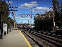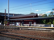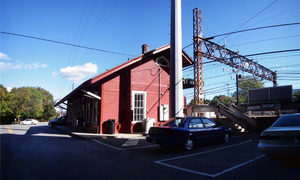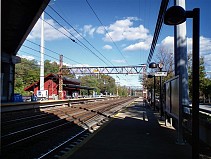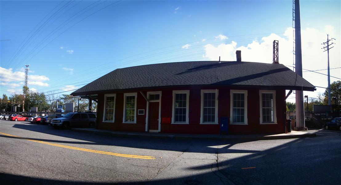 Located just west of the bridge is the Cos Cob train station. This building is also on the National Register of Historic Places, and was built around 1894. The wood-framed station is on the west-bound side of the tracks, and measures 50 feet by 20 feet. The station was constructed during a time when the New York, New Haven and Hartford Railroad was working on a complete overhaul of the line. Curves were straightened, tracks were elevated to remove grade crossings where possible, and two tracks additional tracks were added for a total of four. The relatively simple station design was reused for other stops along the line as a cost-saving measure – the Old Greenwich station is an extant example.