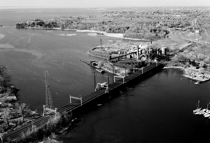 Bridge Company. A previous two-track bridge existed in the same spot, but was deemed unsafe. However, not all parts of the previous bridge were dismantled, some portions were reused in the construction of the current four-track replacement bridge. Historically, this bridge was the final constructed portion of the railroad line linking New Haven and New York – completed on Christmas day, 1848.