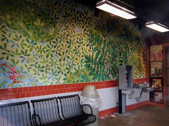 Taylor isn’t a stranger to Metro-North and Arts for Transit – she submitted a proposal for the sculpture at Wassaic station, which was ultimately not selected (the piece by Anne Huibregtse that was selected was a perfect match for the station). From the photos on the internet I’ve seen, the mosaic looks beautiful, however I never got a good look at it. You’ll find a single photo of the mosaic below (taken through the window of the locked station), along with the rest of my photos from Larchmont station.