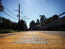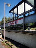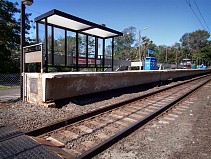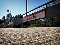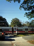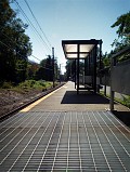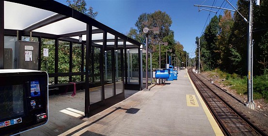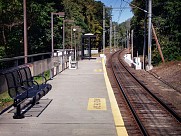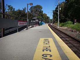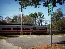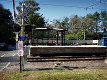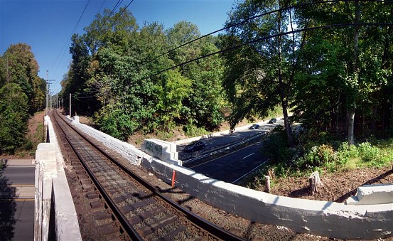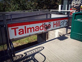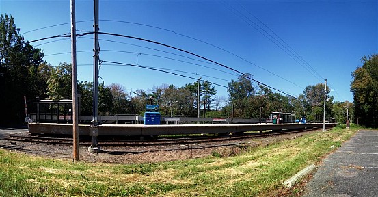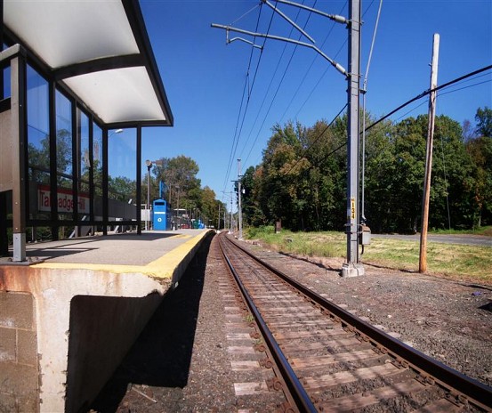 Welcome to Talmadge Hill – the station just south of New Canaan on that eponymous branch of the New Haven Line. Although New Canaan station is quite charming, the remainder of the stations on the branch are fairly regular and unremarkable, and this station is no different. Talmadge Hill is small – the platform accommodates four train cars – and it straddles the space between Talmadge Hill Road and the Merritt Parkway. The majority of the platform is of typical concrete – however the north end on the Merritt Parkway side is a metal grate, which was added on later. From this side of the platform you can get a pretty good view of the Merritt, and the steady stream of automobiles that pass under the railroad tracks. Because of the station’s placement between these two roads, lengthening the platform any further would be extremely difficult. Trains picking up passengers at the station extend out into the road at the grade crossing, temporarily halting traffic on Talmadge Hill Road.