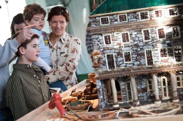 The Holiday Train show is in its 20th year, and the newest historical building to be modeled is the Rockefellers’ home Kykuit. All of the to-scale models in the show have been created using natural parts. Magnolia leaves, pine bark, eucalyptus leaves, plant stems, seed pods, and pistachio shells have all been used in the creation of Kykuit.