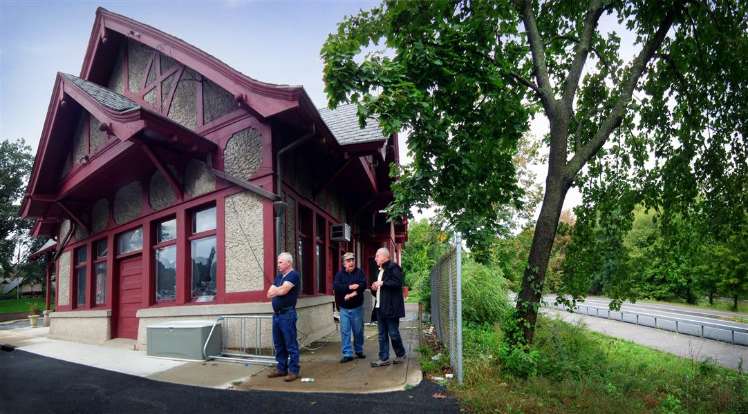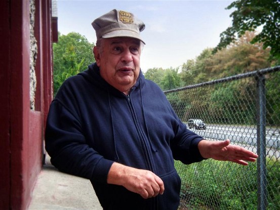 Joe Schiavone, known as the “Old Put Guy,” gives a talk at Briarcliff Manor. The former rail line is slightly visible, located in between the fence and the road. It has been converted to a rail trail.