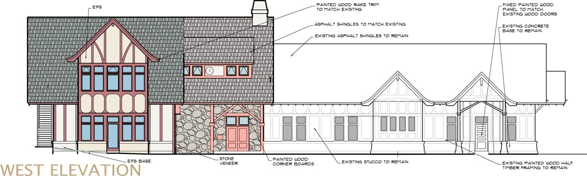 Architect’s elevation of the front of the library. The original portion of the building is shown uncolored.