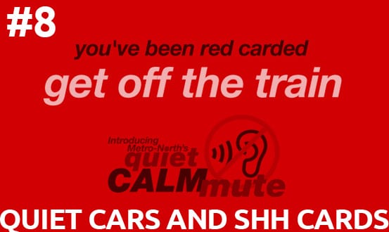 Before the quiet car program started, Metro North said that conductors would have “Shh Cards” to pass out to loud people to tell them to shut their traps in a nice, passive way. I thought the idea was amusing, and managed to get my hands on some of the cards before the program debuted. And they were a little bit too nice – I was unable to resist making modifications to them… and even printing out a few. The fake shh cards posted under the title of Quiet cars and Shh cards was the eighth most popular on the site in 2011, and the cliffhanger I’ll leave you with until later on this week.