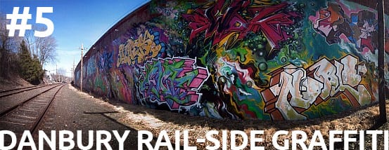 Many times I’ve passed through the streets in Danbury and sighted a particular wall covered with some absolutely gorgeous graffiti. Every time I did, I always thought that I should go and take a photo of it… but I never got a chance to do it until March. In the post Gorgeous rail-side graffiti in Danbury I posted photos of the mural (which was a lot larger than I had originally suspected). The painted wall is located just off of Main Street in Danbury, not far from the Metro-North station, and located along some railroad tracks.