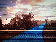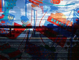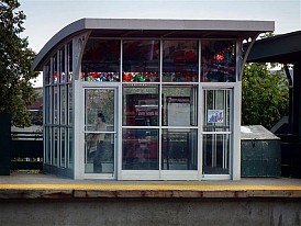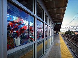 The artist behind the work at Port Chester is Bernard Greenwald – though born in New Jersey, he’s currently based in Red Hook, NY. A friend of Greenwald’s suggested he submit his work for Arts for Transit’s call for artists for a piece at Port Chester station. Out of nearly 400 entrants, Greenwald was one of four finalists chosen to make a final proposal. Ultimately his art was selected for the commission, and he created 40 paintings of the Port Chester area. The designs from these paintings were then silk-screened between glass panels by a glass fabricator in Long Island, and installed in various shelters located on the platform at the station. It is a lovely addition to a nice spot on the New Haven Line.