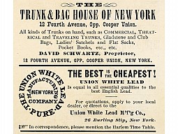 The Union White Lead Manufacturing Company, which also advertised here (though it does seem like a strange thing to advertise in a timetable), was organized in 1828. Their complex in Brooklyn covered over twenty-three city lots, and could produce around 3,000 tons of lead per year. Although the lead smelting operation there ceased in 1904 (and the buildings demolished), the surrounding soil is contaminated with lead even today.