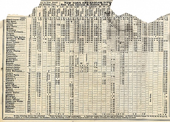 Even if the whole thing isn’t there – some train times are missing, and part of the fare list has been eaten away – I still love this timetable. It does list several old stations that no longer exist, like 86th Street (which is now an emergency exit in the Park Avenue Tunnel), Morrisania, and Kensico. What is left of the fare list is interesting, especially to see the prices and the types of tickets offered. In addition to single rides and round trips (good for 3 days), there were quarterly tickets (good for 3 months), and ticket books for the whole year. A one-way from Katonah cost $1.00, a round-trip $1.75, and a yearly ticket cost $100 – a savings of $7 from the quarterly tickets (quarterly tickets were cheaper at the end of the year, and most expensive at the beginning).