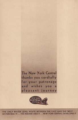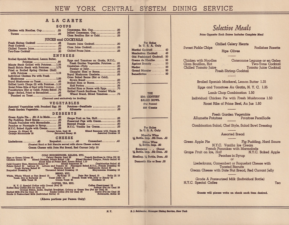 That’s probably a generic dining service menu, not specific to the Century (which offered, among other exotic items, watermelon rind pickles). There’s one other clue, the alcoholic beverages listed in the center column as for sale in the States only. Not an issue on the Century, which stayed in the USA, but the Montreal, Toronto, and Detroit via St. Thomas, Ontario, services passed into Canada, where the Central probably wasn’t fully licensed under provincial authority. Interesting, though, to see a half grapefruit as a dessert.