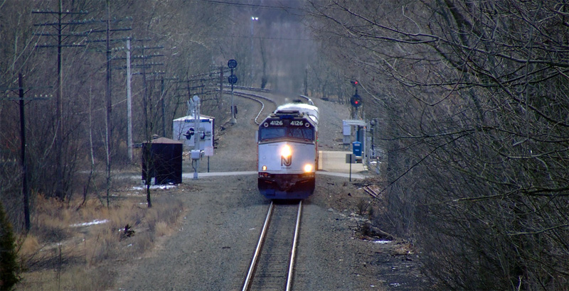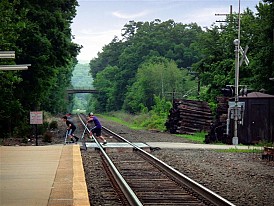 Train arrives at the small Sloatsburg station in 2007. [image source]