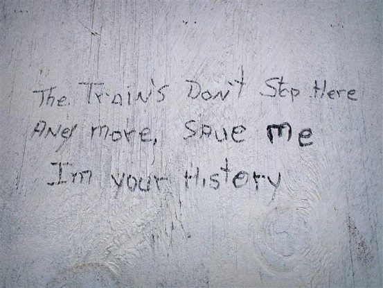 Hidden away in a nearly-forgotten corner of my computer’s almost-full hard drive are a few photos that were never meant to see the light of day. They were dark, and the day was rainy, and they were downright horrible. But a bit of graffiti scrawled on the side of the station that I remembered photographing always sat in the back of my mind. It read, “The trains don’t stop here any more. Save me, I’m your history.” A news article that was sent to me today (thanks, Jeff!) led me to dig out those photos.