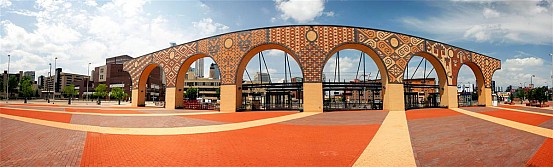 Admittedly, from railroading point of view, a light rail system like the Hiawatha Line isn’t the most interesting thing to watch. But Minneapolis is big into public art, and obviously their fairly new rail system would be no exception to that. I think it is the blend of rail infrastructure and aesthetic beauty that has captured my interest. Everything about the system, right down to the bricks on the platform, seems designed to be visually pleasing. It is amazing how simple things, like a few colored windows, or the aforementioned bricks arranged into colorful patterns, make such a great impact! But not everything would fall into the category of “little things” – in some instances the station artwork is huge. Downtown East – Metrodome station, for example, has towering patterned arches that dwarf the station itself. The piece evokes the image of the historical Stone Arch Bridge, only a few blocks away. Trains, art, and nods to history? No wonder why I love this place!