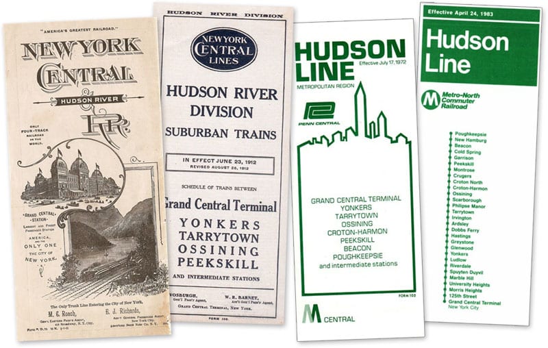 Timetables along the Hudson Line, from 1901, 1912, 1972, and 1983.