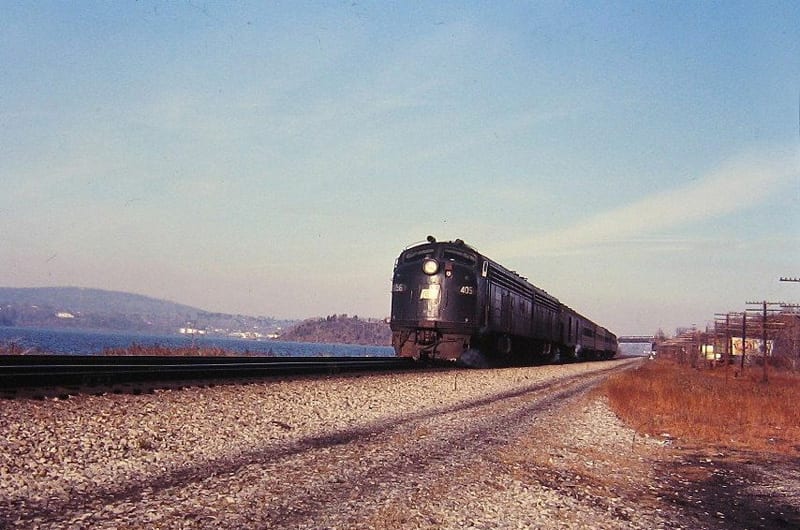 Penn Central locomotive passes by Breakneck Ridge in 1971.