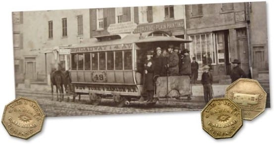 Early photograph of a New York and Harlem Railroad horsecar. New York & Harlem transfer tokens from the American Numismatic Society.