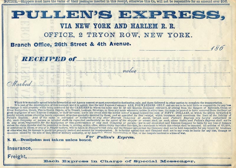 One of the New York & Harlem’s earliest stations in Manhattan was at Tryon Row, a street that no longer exists. At the time the “trains” were being pulled by horses, and there were short cars – pulled by two horses, and longer cars – pulled by four or more horses. Downtown service used the shorter cars, and Tryon Row served as a point of change for people heading north in the longer cars. The station also housed a place called Pullen’s Express, from where you could send packages or money to be carried over the Harlem. I happened to find a rather interesting artifact recently – an example of the form a customer would fill out to use the service in the 1860’s.