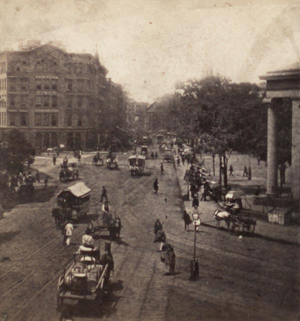 View of the neighborhood surrounding Tryon Row. 41 Park Row, which still exists today, is visible in the background – along with several horsecars. On a little bit of a tangent, the ASPCA was formed in 1866, with a primary focus on protecting the rights of horses – many of which pulled the earliest “railcars.”
