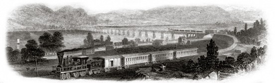 Image 25 (“etching, origin unknown”) is the Pennsylvania Railroad’s first Rockville Bridge across the Susquehanna River a few miles north of Harrisburg, PA. It was a single track wooden structure opened in 1849. It was later replaced with an iron bridge and then, in 1902, the landmark “longest stone-arch bridge in the world” that’s still in use today.