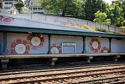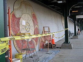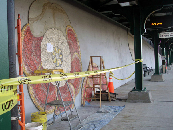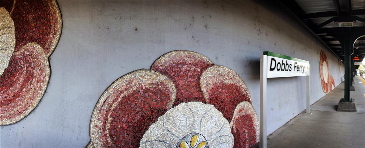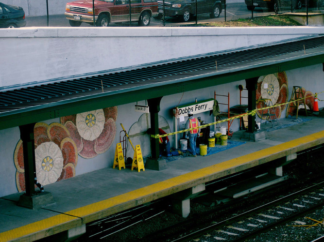 Floating Auriculas, the lovely mosaic found at Dobbs Ferry, is probably the nicest thing you’ll find on the platform. Behind this piece is artist Nancy Blum, who has created public art for venues across the country. My love for the transit system in Minneapolis has been well documented on this site, and I was surprised to note that not only is Blum working on the art for three stations on the new Central Corridor line, she also did the art on my favorite, East Bank station. Blum has done public art in various media, but for the most part the underlying theme is nature and the natural world, and the piece at Dobbs Ferry certainly fits that theme. Blum’s lovely auricula flowers, about eight feet in diameter, adorn the side of the northbound platform, rendered in mosaic form using Italian glass and marble tile.